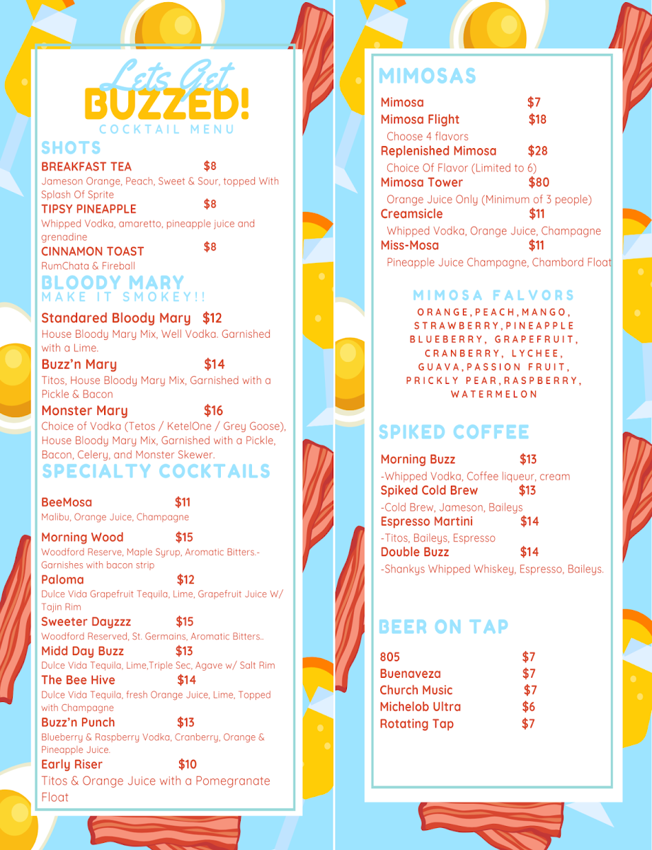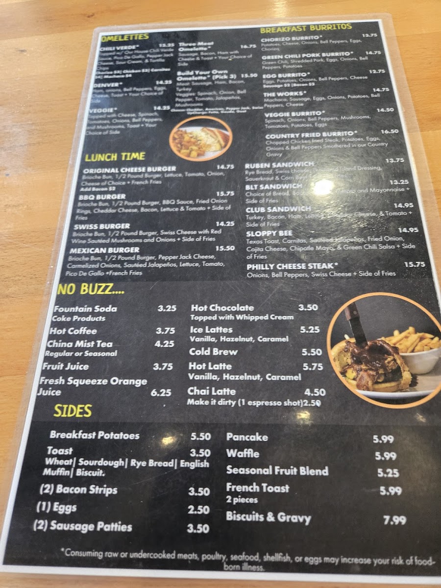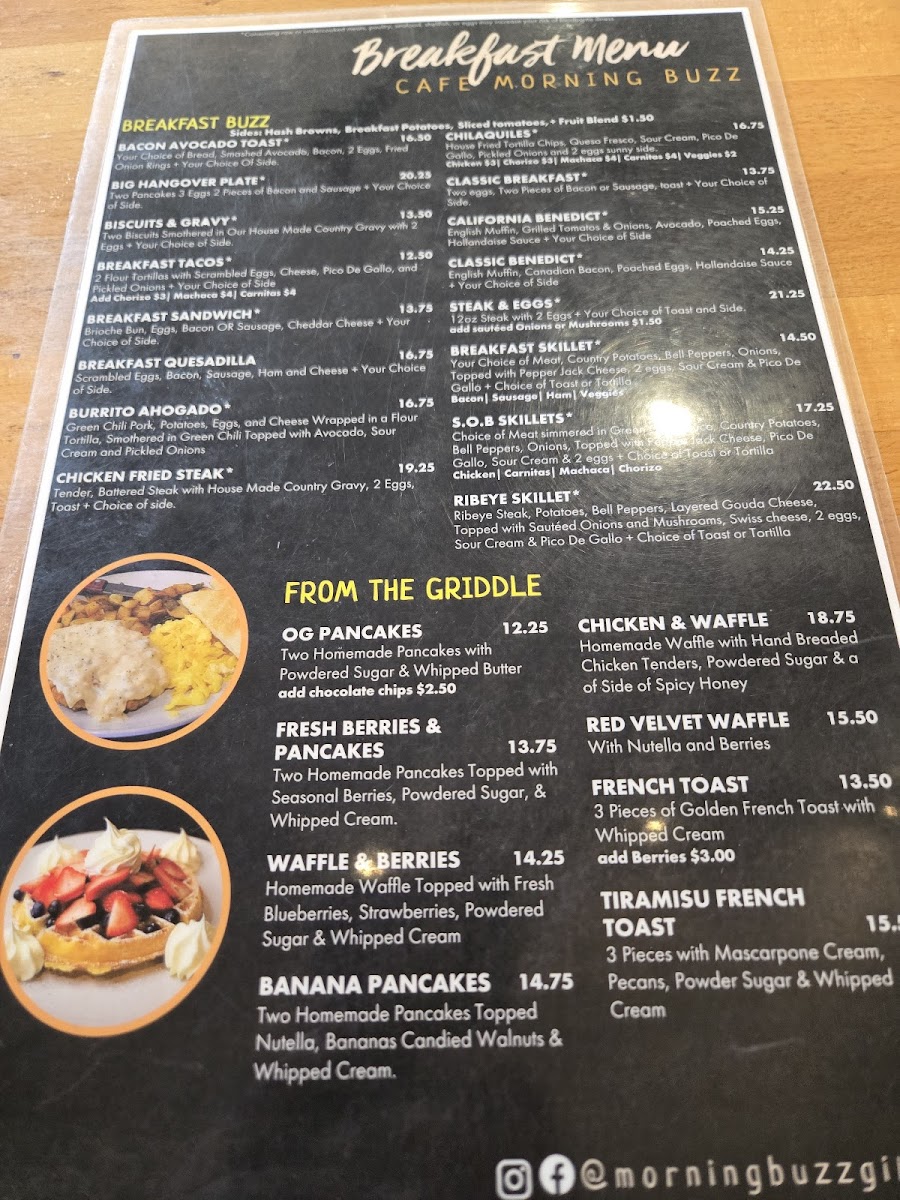 Families are clearly considered too, with a dedicated For The Kids option that keeps younger diners happy. From the griddle, favorites such as Original Pancakes, Fresh Berries, Banana Pancakes, Waffles And Berries, and Chicken And Waffles deliver that indulgent breakfast feel many guests are looking for. The “Breakfast Buzz” section ties everything together with hearty plates like Classic Breakfast, Chicken Fried Steak, Steak And Eggs, Biscuits And Gravy, and Burrito Ahogado, showcasing the restaurant’s focus on generous, satisfying portions.