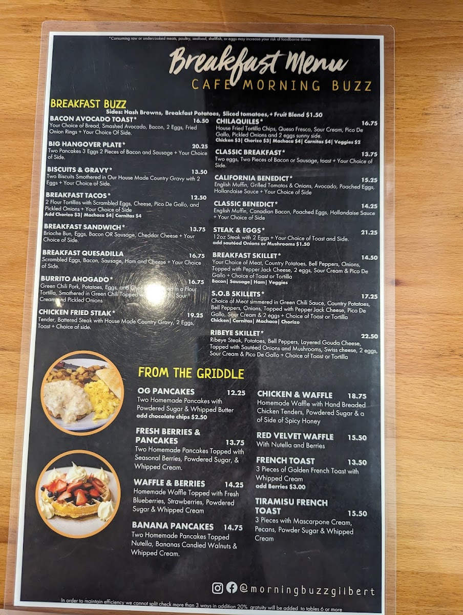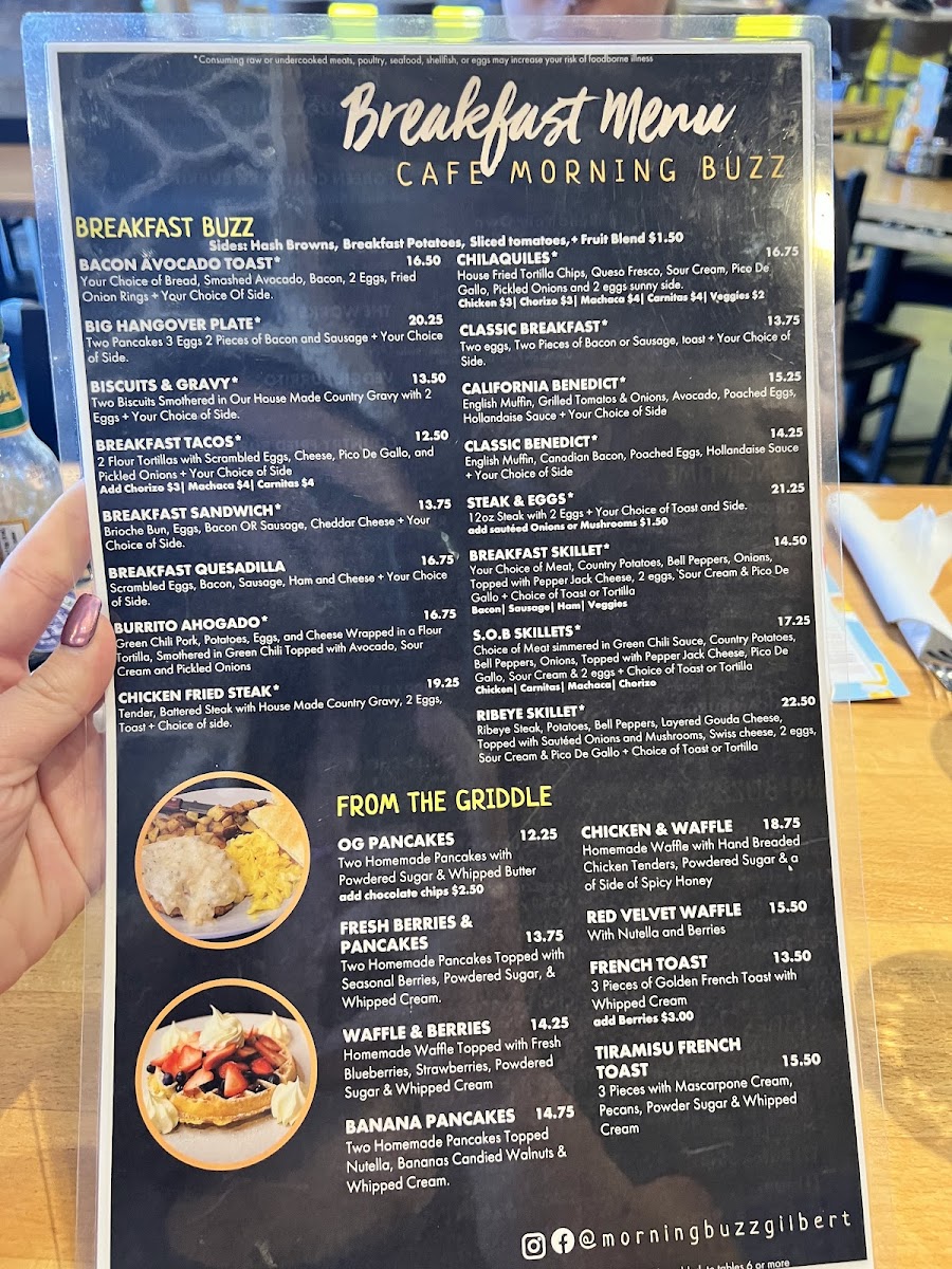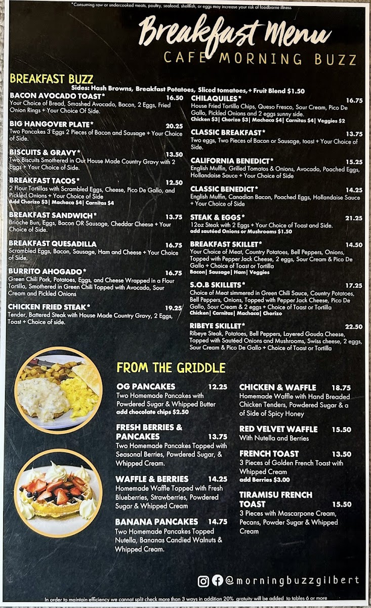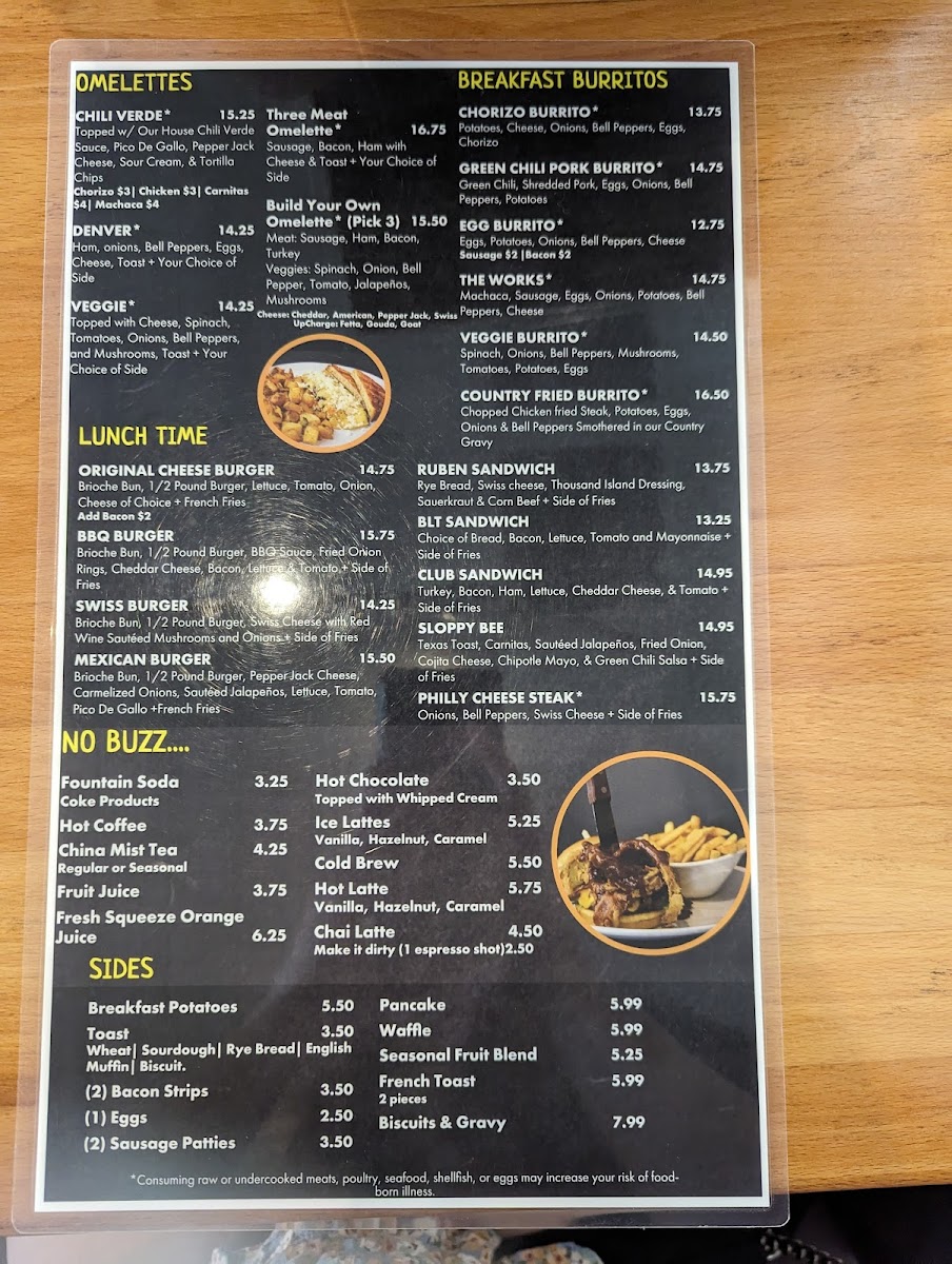 Families are clearly considered too, with a dedicated For The Kids option that keeps younger diners happy. From the griddle, favorites such as Original Pancakes, Fresh Berries, Banana Pancakes, Waffles And Berries, and Chicken And Waffles deliver that indulgent breakfast feel many guests are looking for. The “Breakfast Buzz” section ties everything together with hearty plates like Classic Breakfast, Chicken Fried Steak, Steak And Eggs, Biscuits And Gravy, and Burrito Ahogado, showcasing the restaurant’s focus on generous, satisfying portions.